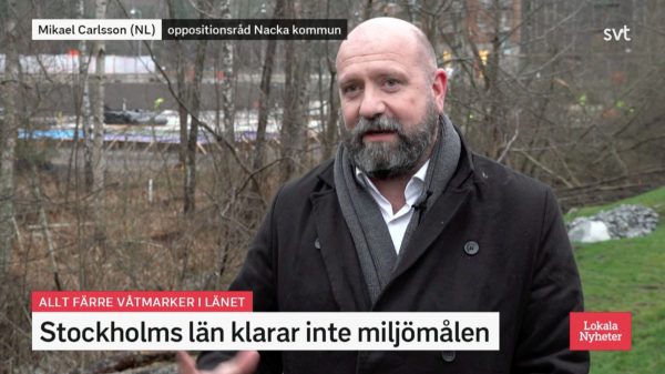 Nackalistans oppositionsråd Mikael Carlsson pratade om missade miljömål på SVT Play Lokala nyheter. Målet om myllrande våtmarker ser inte ut att nås, men Nackamoderaterna försökte försvara exploatering av värdefull natur.